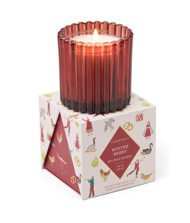 Introducing our new collection of ribbed glass tinted in rich hues and filled with festive scents. Hand illustrated artwork inspired by the classic 12 Days of Christmas adorns each package. Candles come in a special giftbox that’s fun to open.