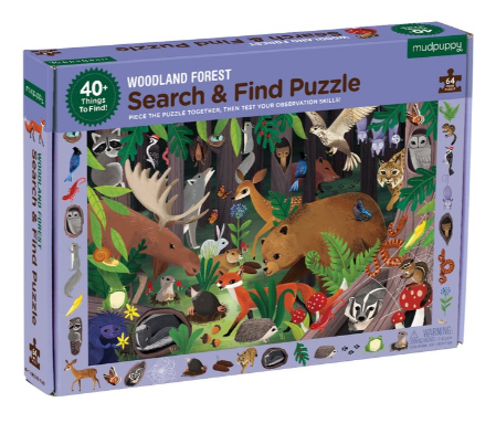 Mudpuppy’s Woodland Forest Search & Find Puzzle is double the fun! First, children can piece together the 64-piece puzzle featuring diverse and colorful animals living in the forest. After putting the puzzle together, children can test their observation skills to find the 40+ animals, insects, and plant life in the border around the puzzle image. They are all there, can you find them?
