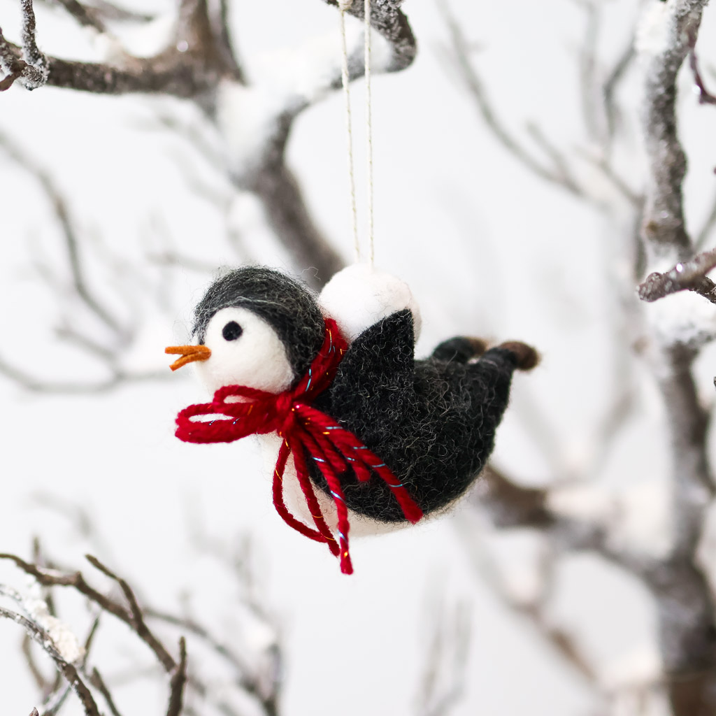 Crafted out of styrofoam and wool, this cuddly baby penguin is headed home for the holidays and is a charming complement to any Christmas tree.