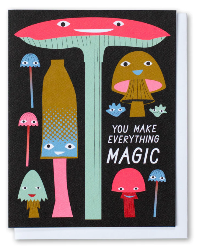 A vibrant notecard with crowd of cheerful mushrooms and a You Make Everything Magic greeting. This is a special one, guaranteed to please.